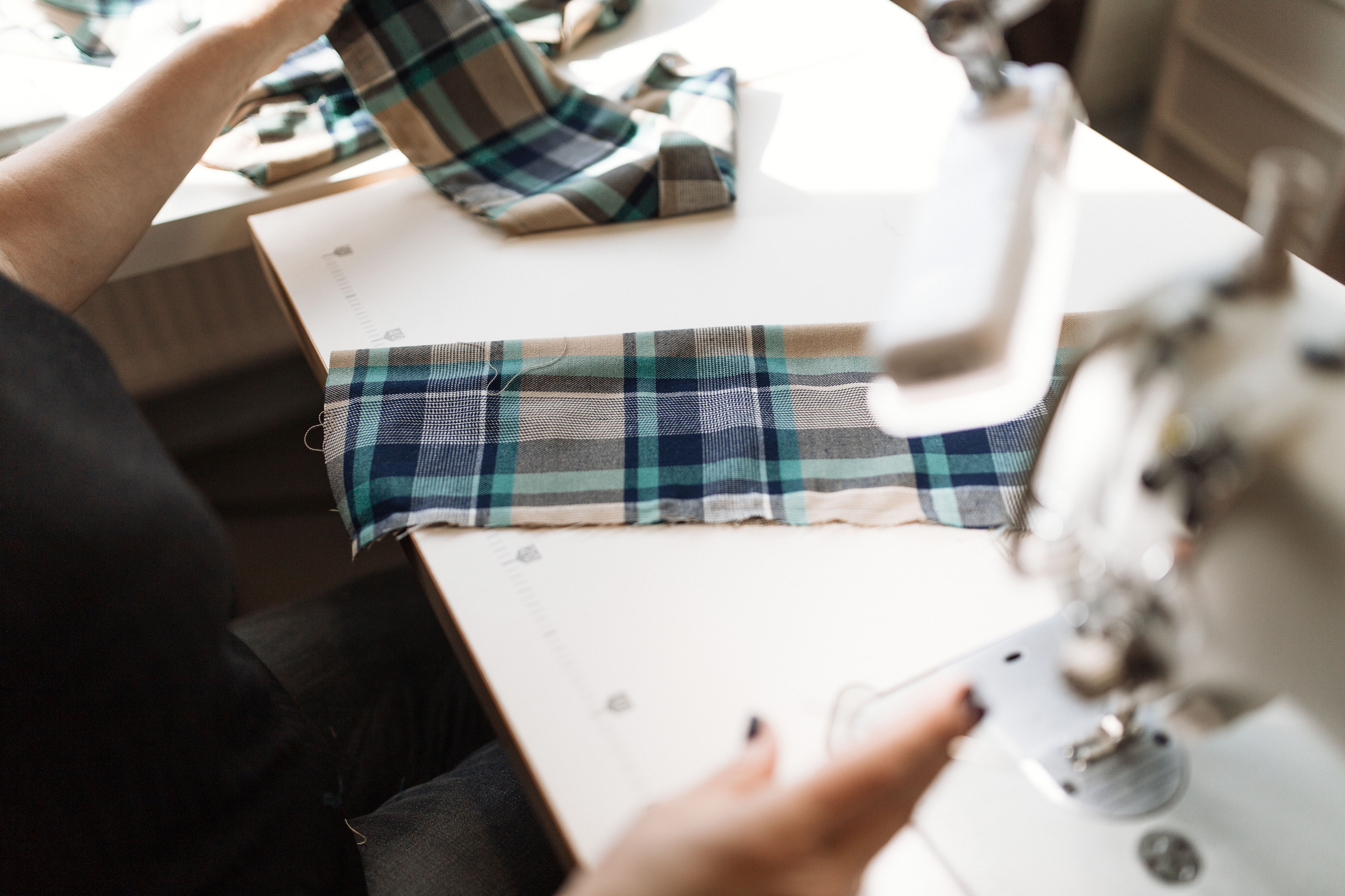 When we work with checked or striped fabrics, we take extra time to align the pattern across all seams — from the bodice to the sleeves, cuffs, and side seams. This requires precise hand‑cutting and careful sewing to ensure the lines match perfectly. It’s a slower process, but essential for achieving a clean, harmonious look.