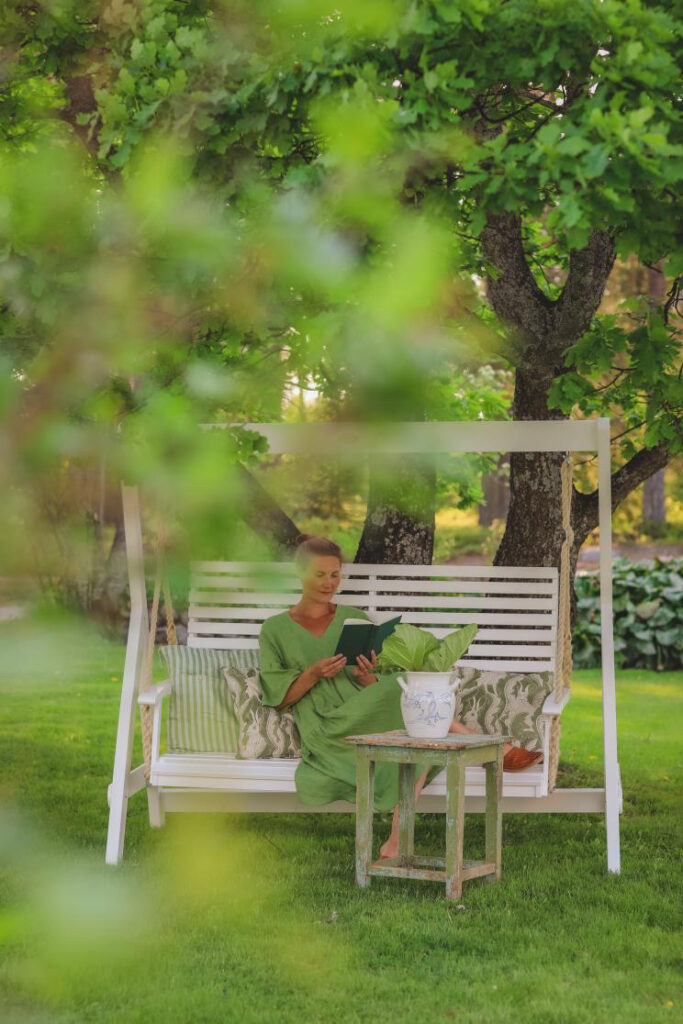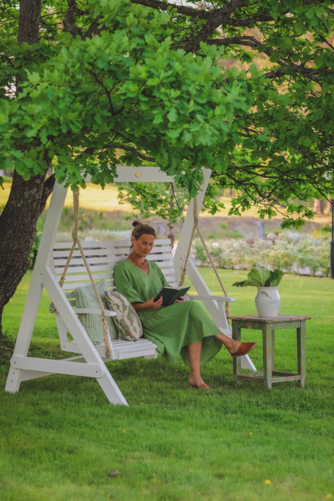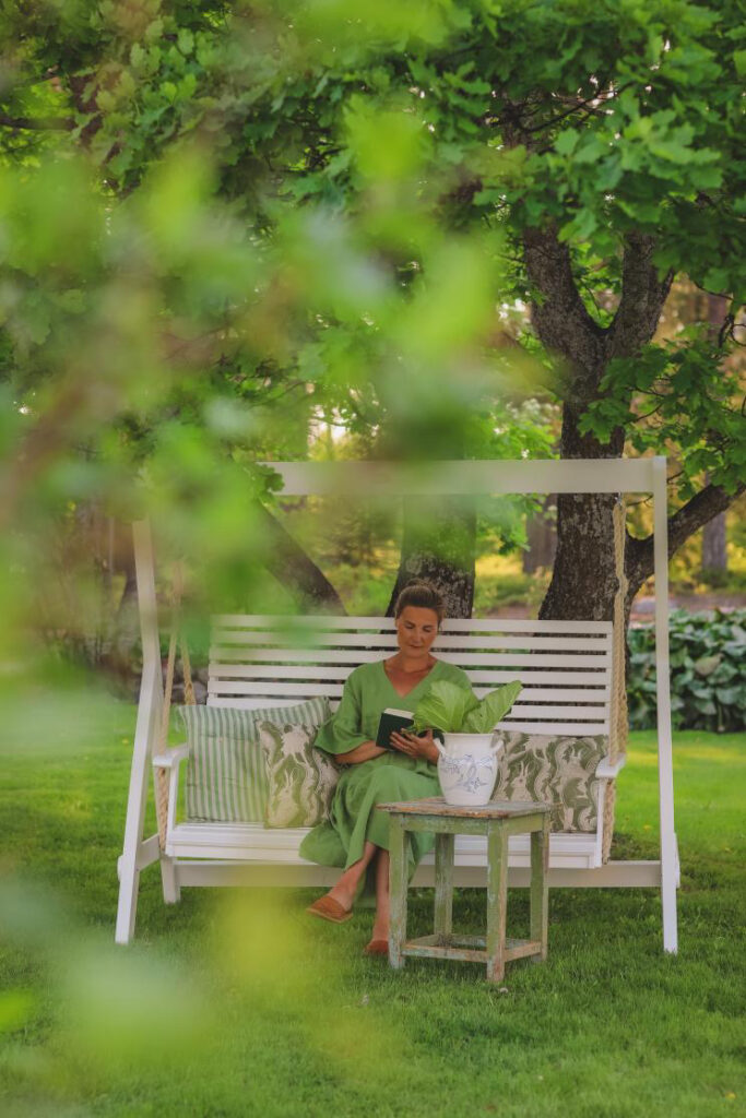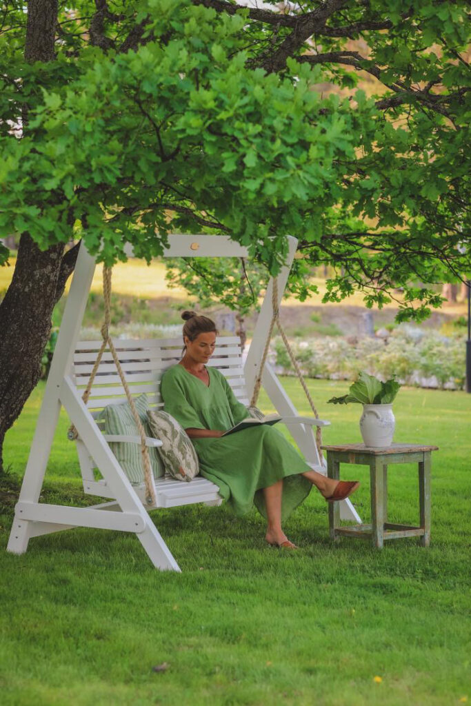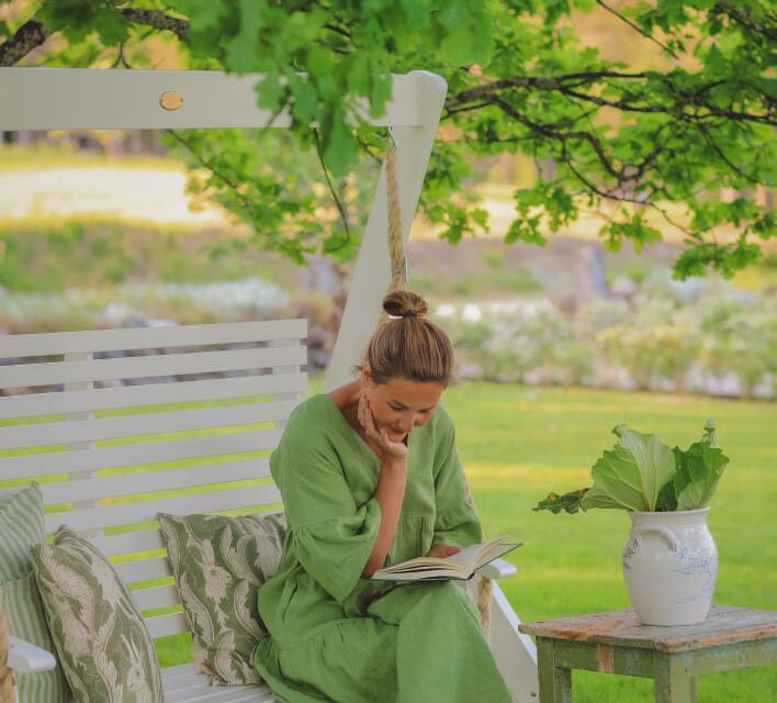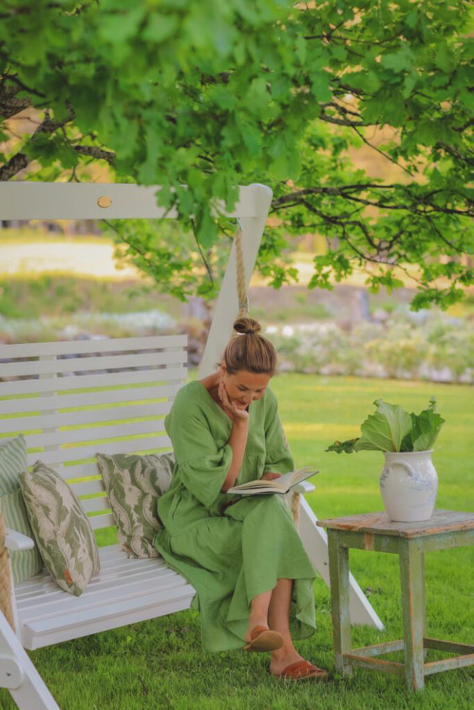 Lovely Frida wearing our foliage linen dress ADELE, surrounded by green and the hush of a slow afternoon.