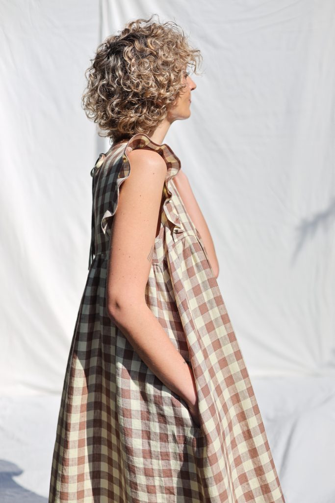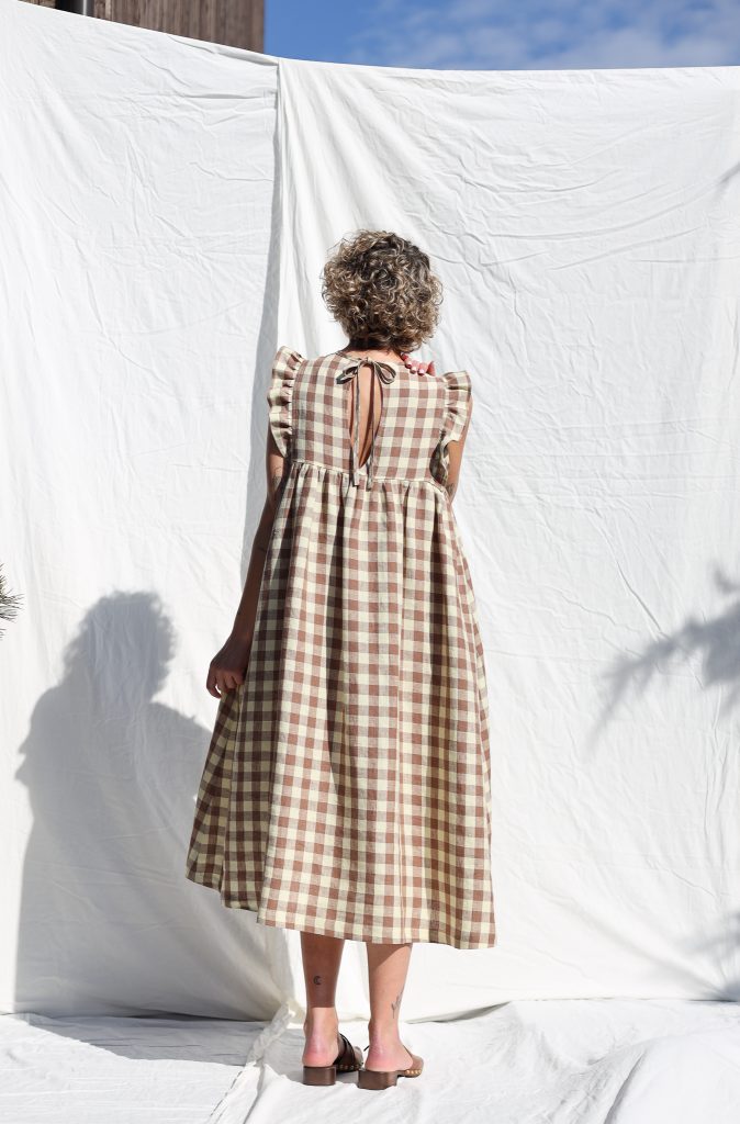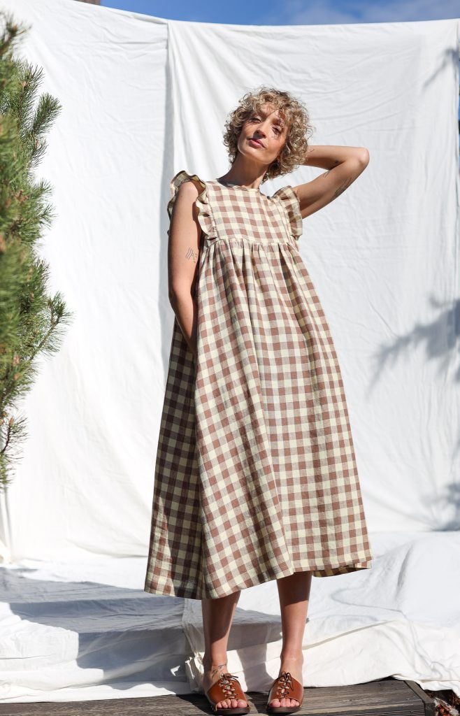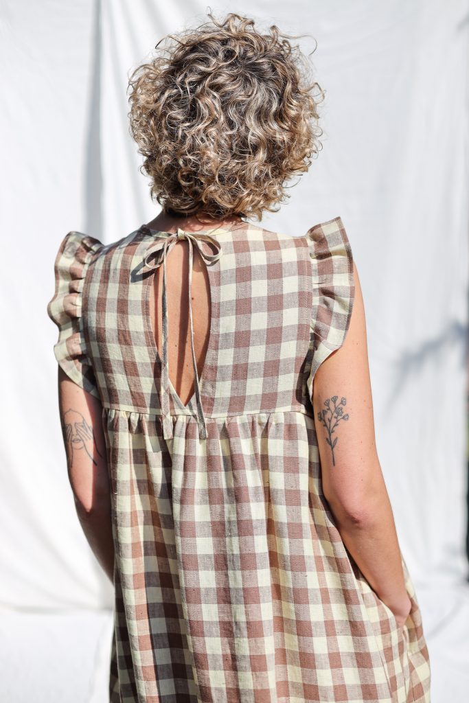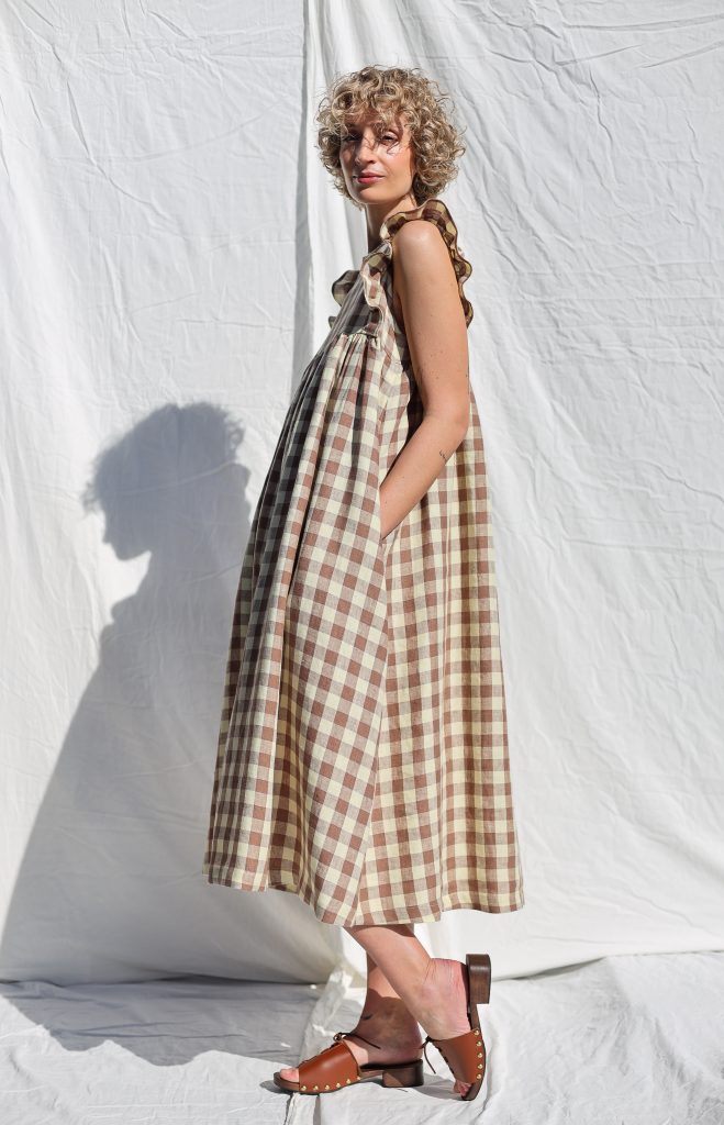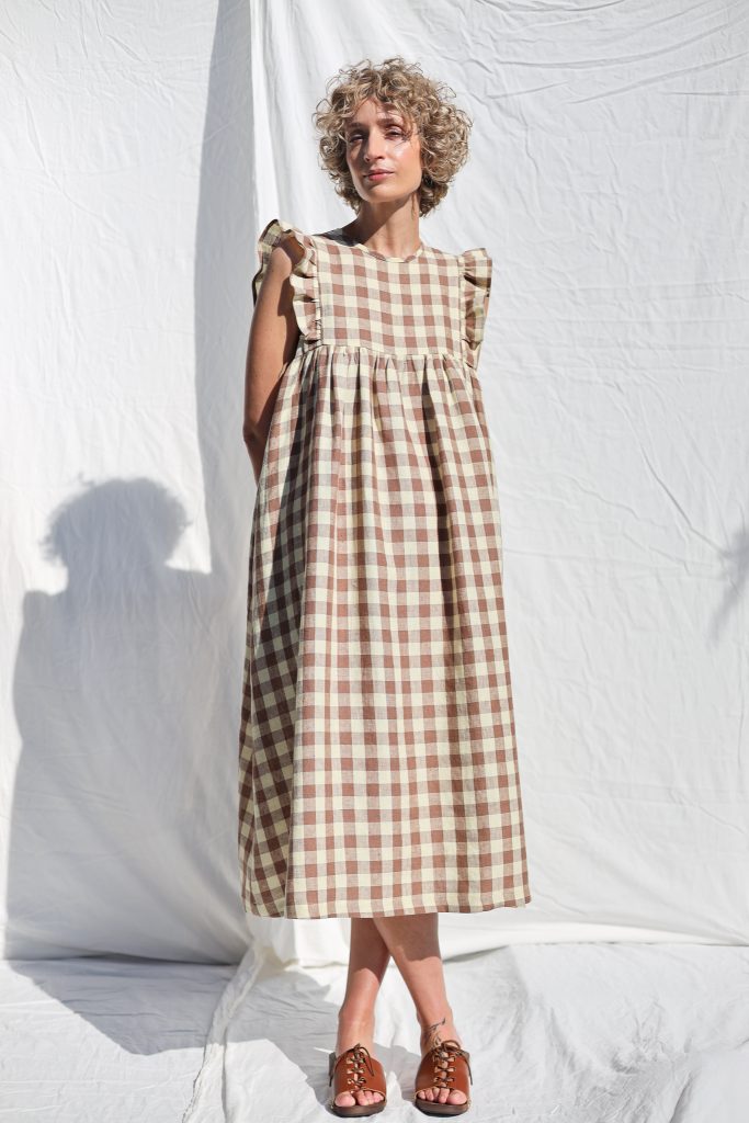Feminine, elegant look. Perfect for everyday or special occasions. Made in mid-weight pre-washed and exclusively woven Hazel & Butter Yellow Checks color linen.