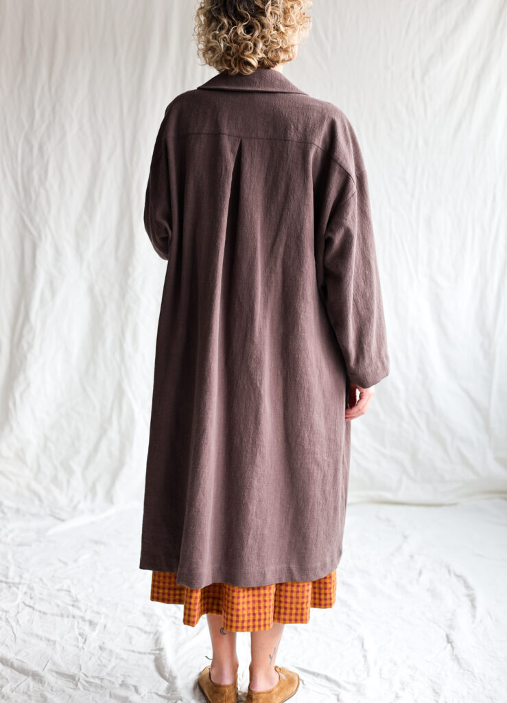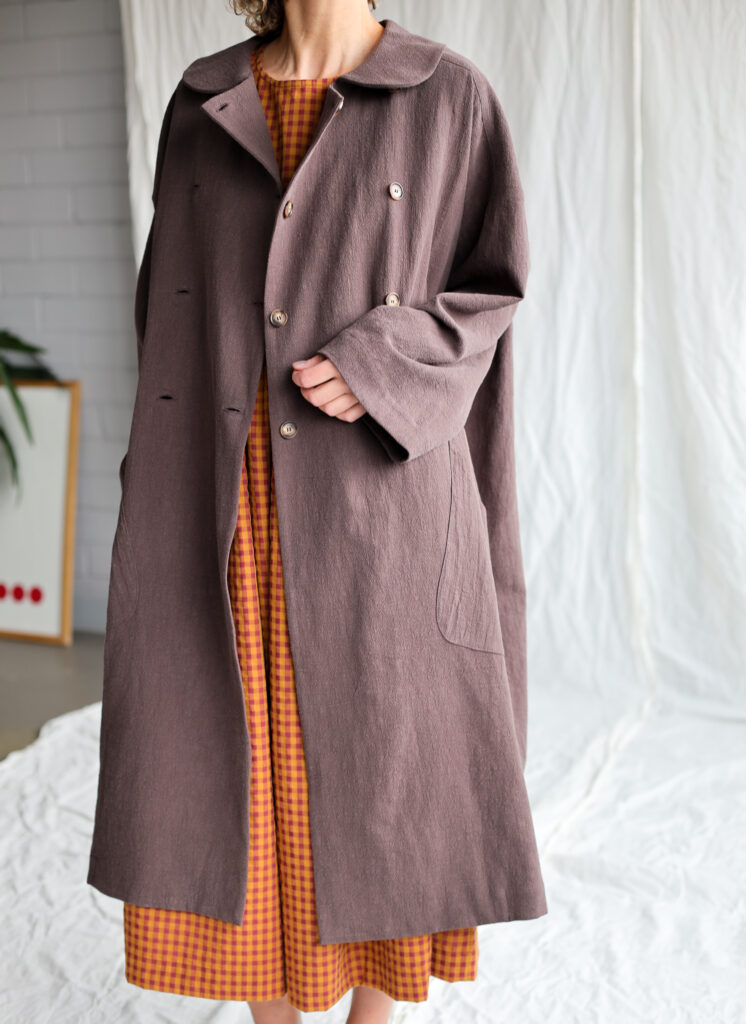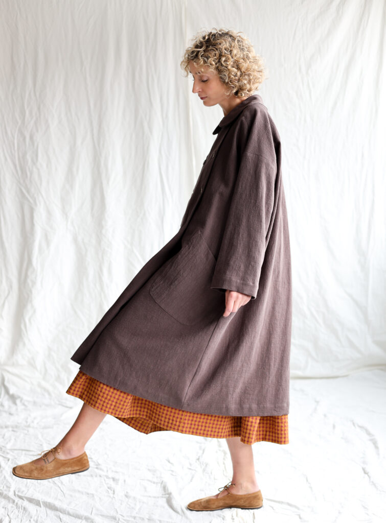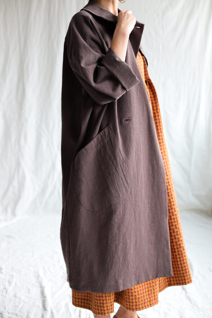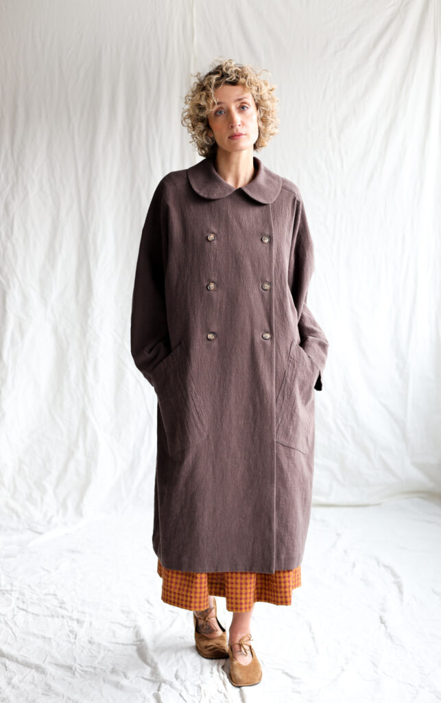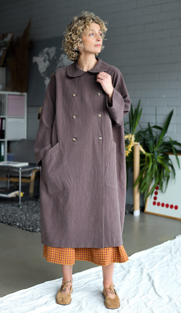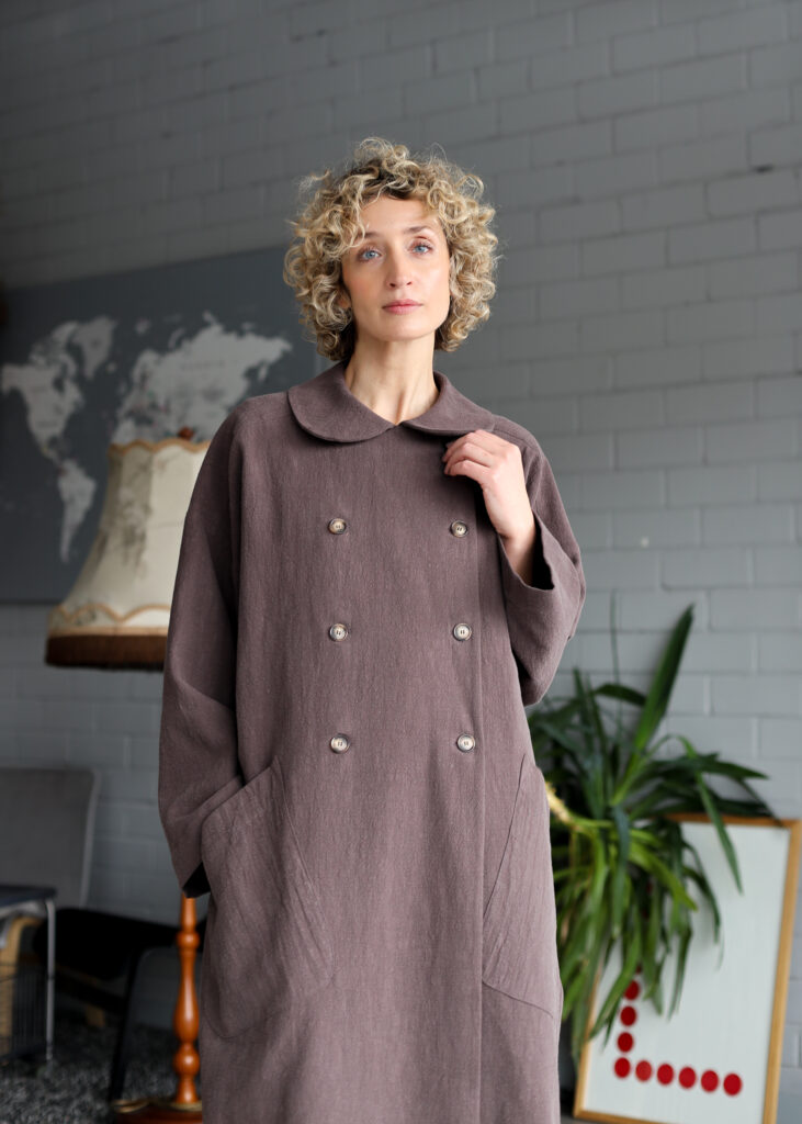 A beautifully crafted long coat made from textured highest quality linen fabric, featuring a soft rounded collar, double‑breasted button closure and an effortlessly oversized silhouette. Its relaxed drape, wide sleeves and large front pockets create a timeless, artisanal look—perfect for layering and everyday comfort.
