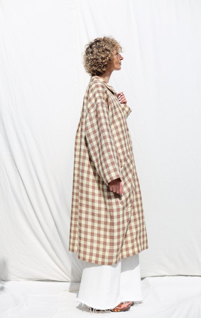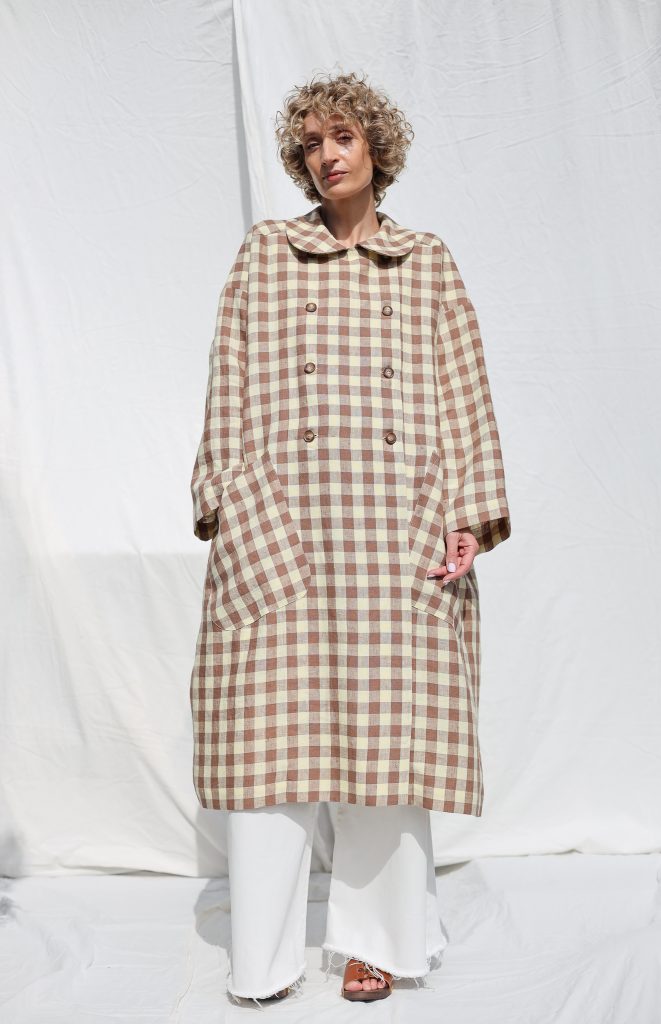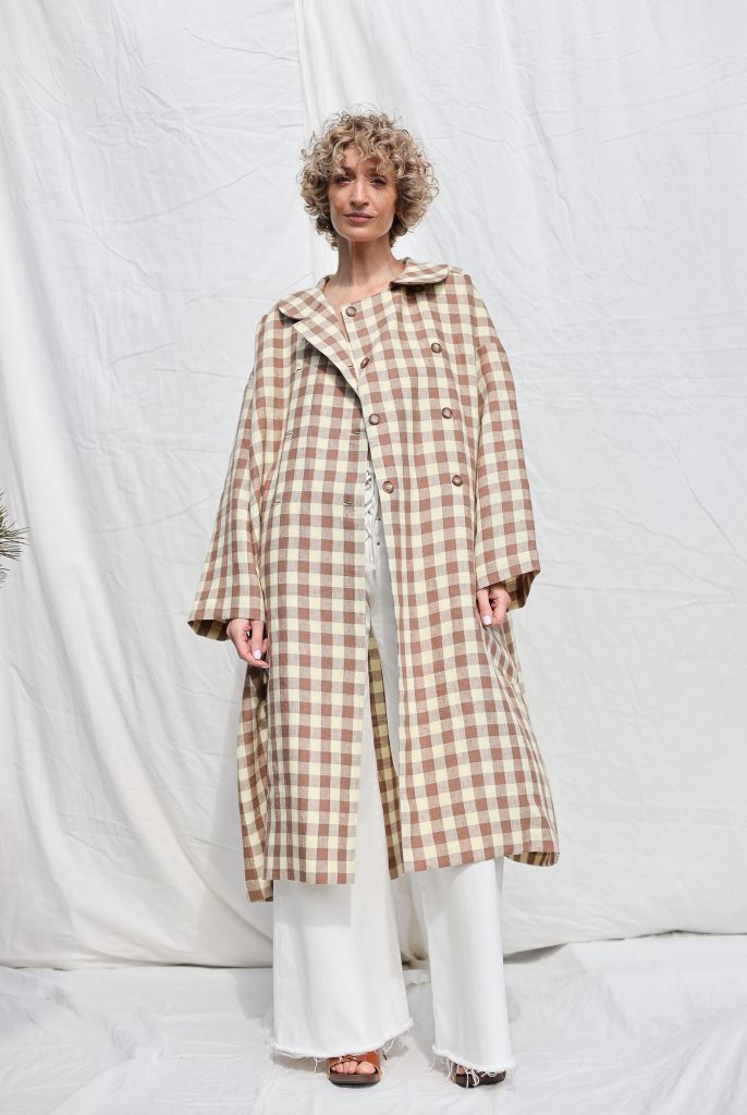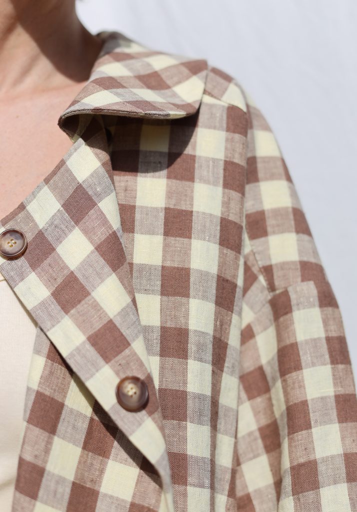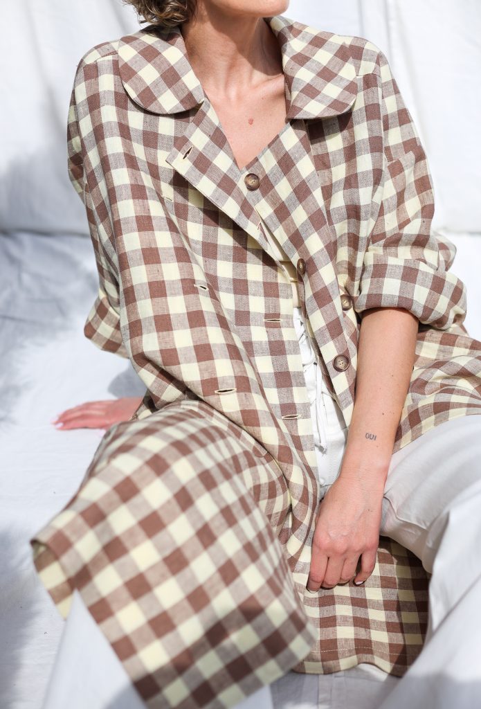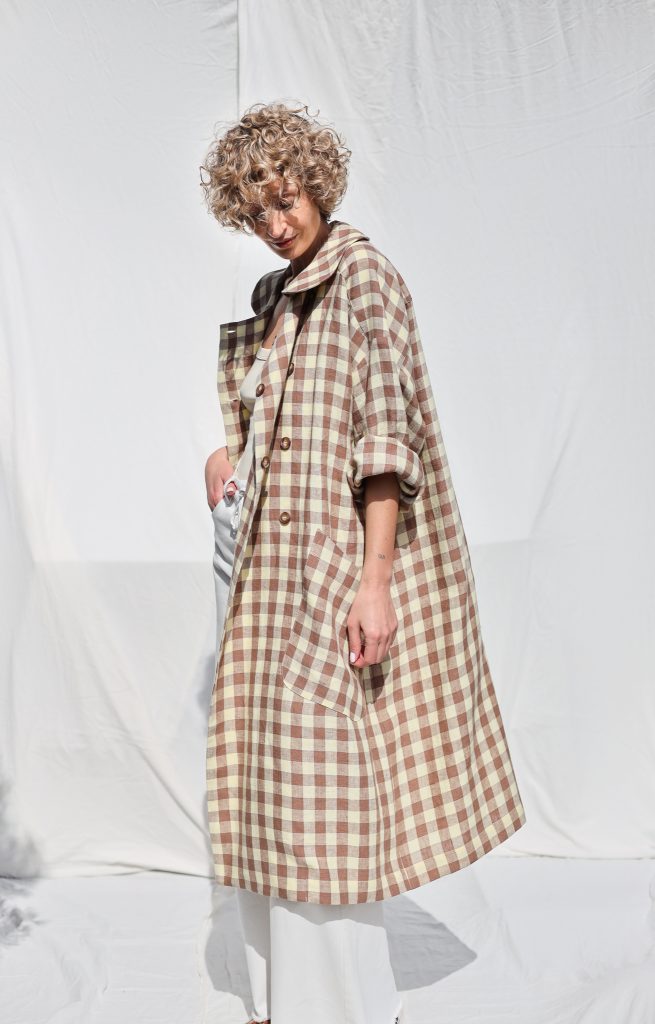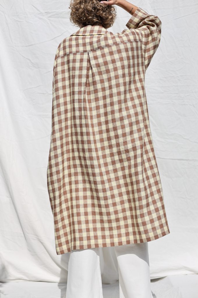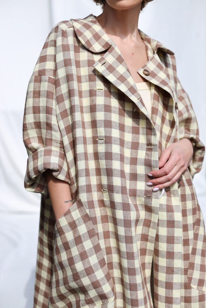 Made in mid-weight pre-washed and exclusively woven Hazel & Butter Yellow Checks color linen. Versatile comfortable oversized fit, elegant and feminine look.