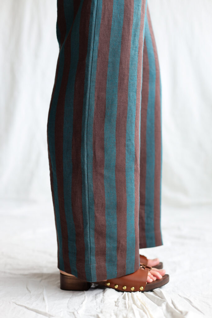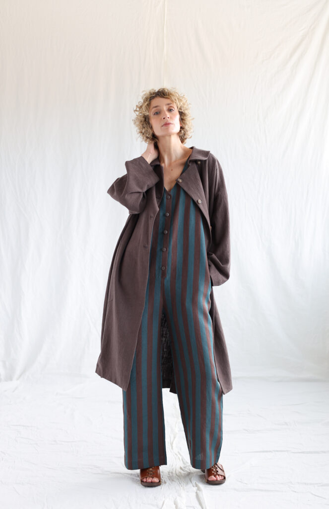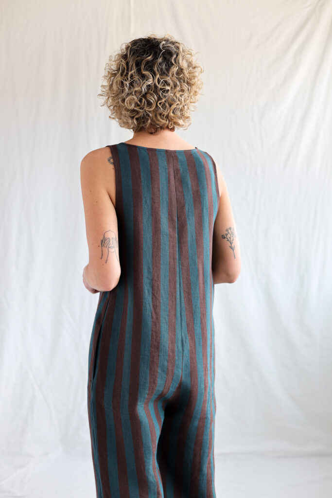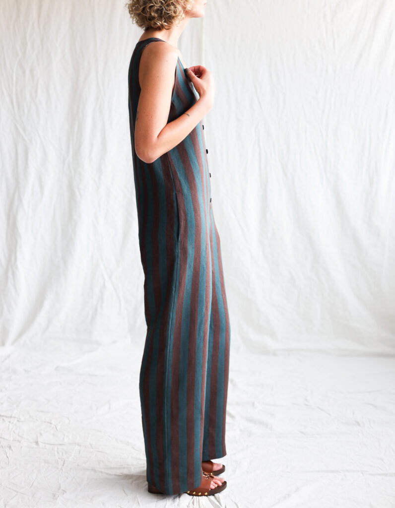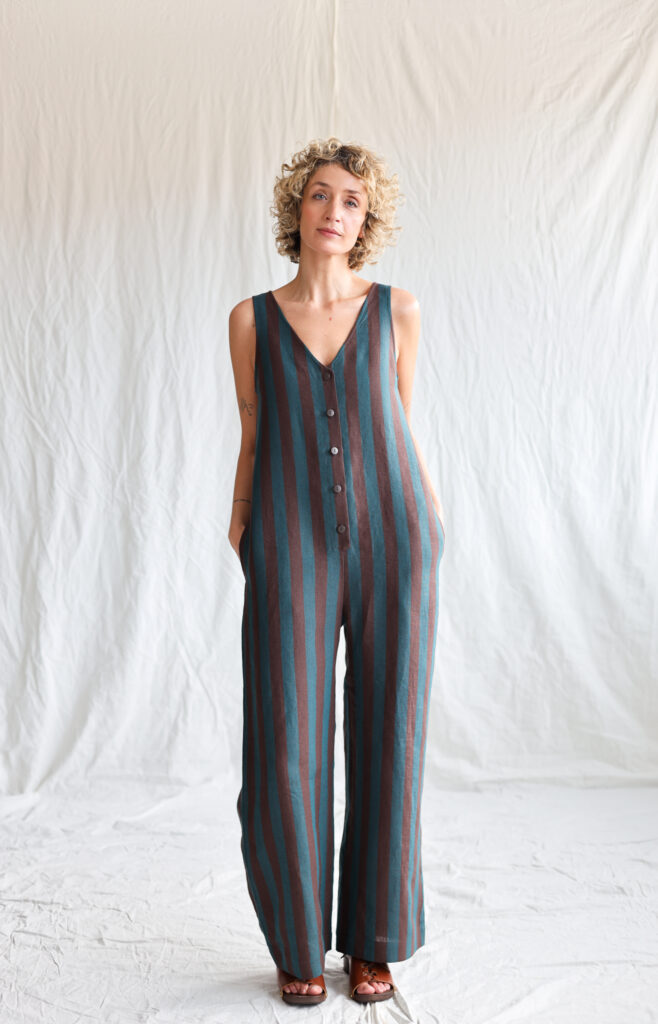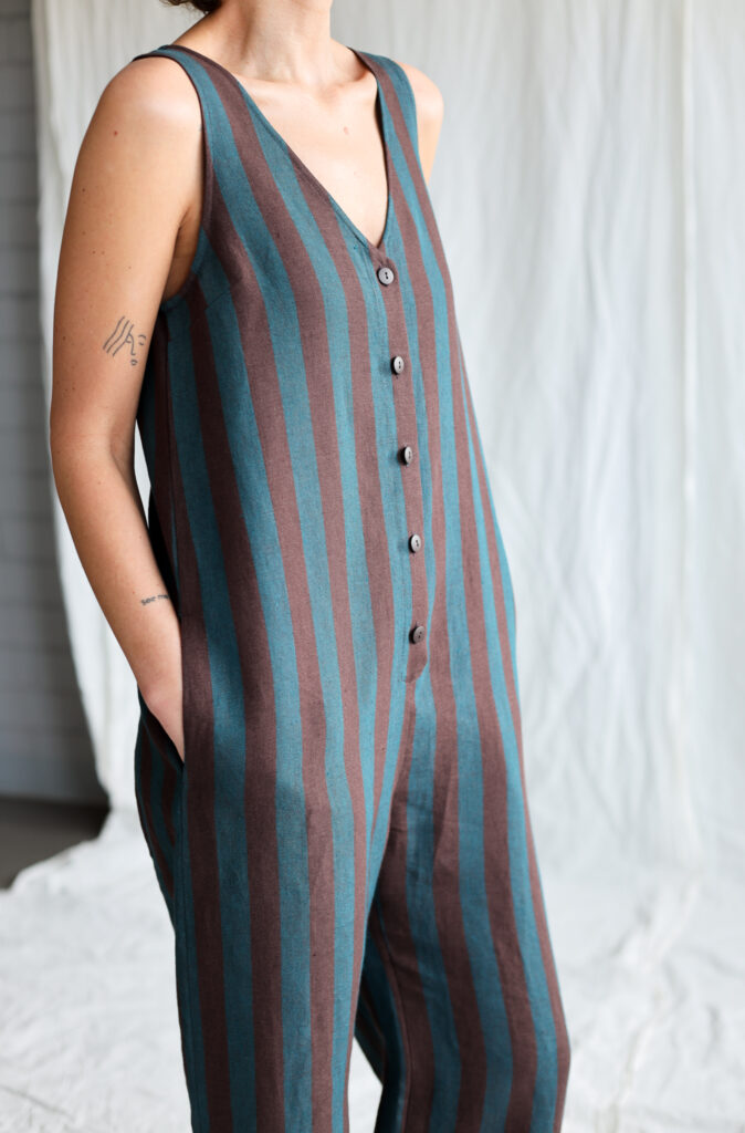 Jumpsuit made in mid-weight pre-washed and exclusively woven Brown and Dark Turquoise Stripes color linen. Loose and comfortable fit, sleeveless body with buttons down the front, V neckline, wide and full length legs.