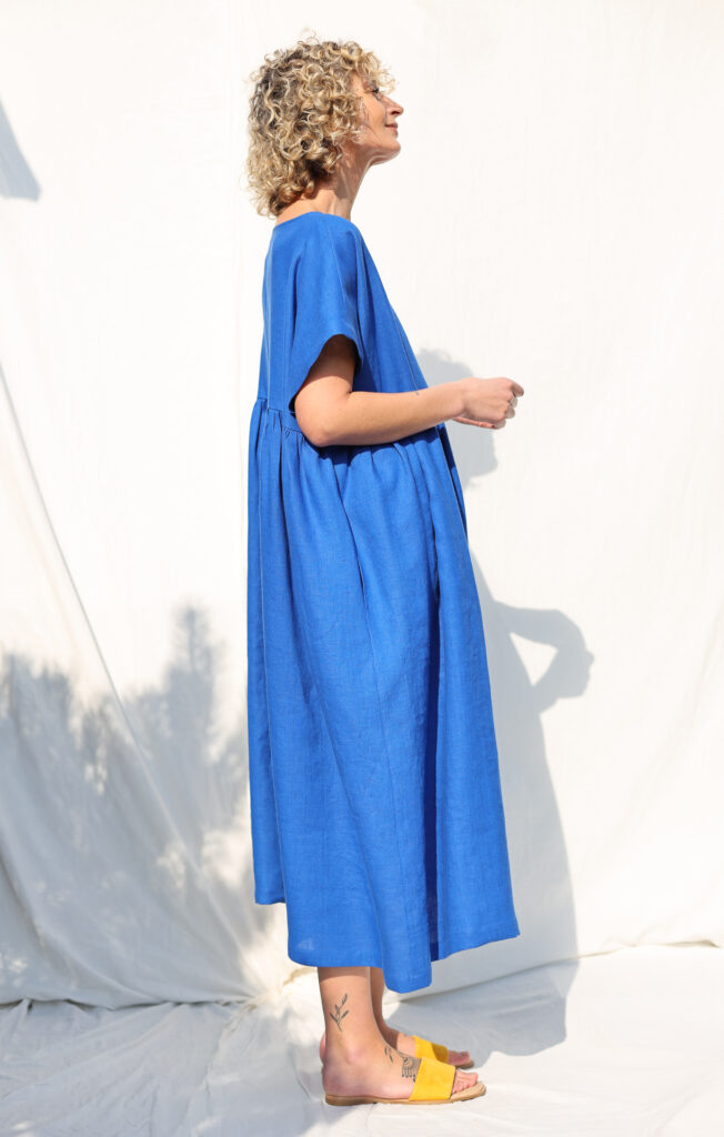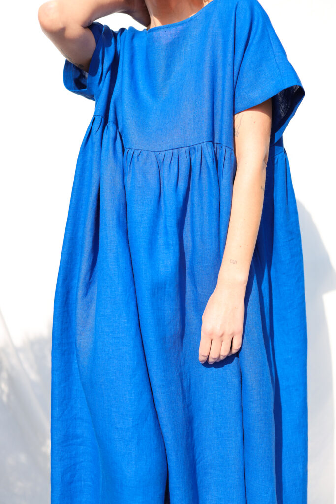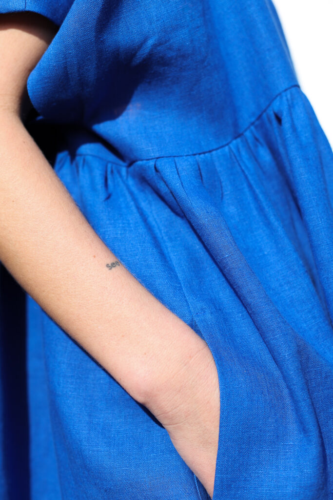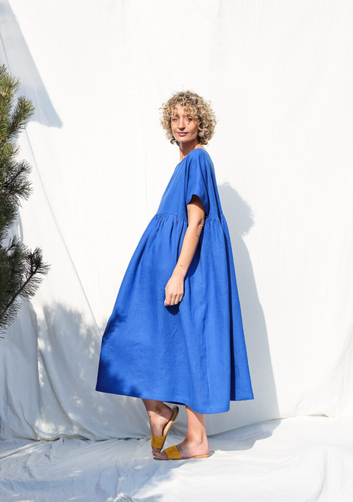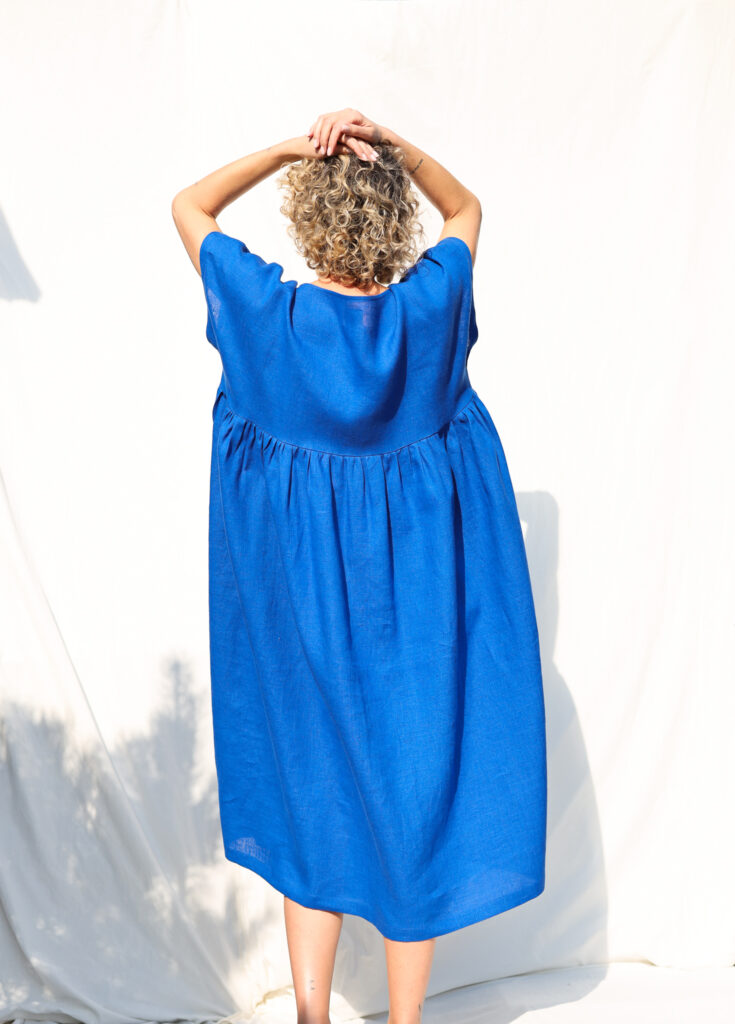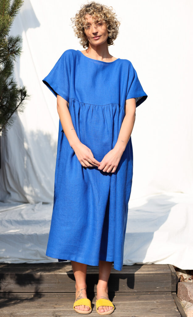 Simona is wearing linen dress in size S – XL and is 172 cm/5’8″ tall.