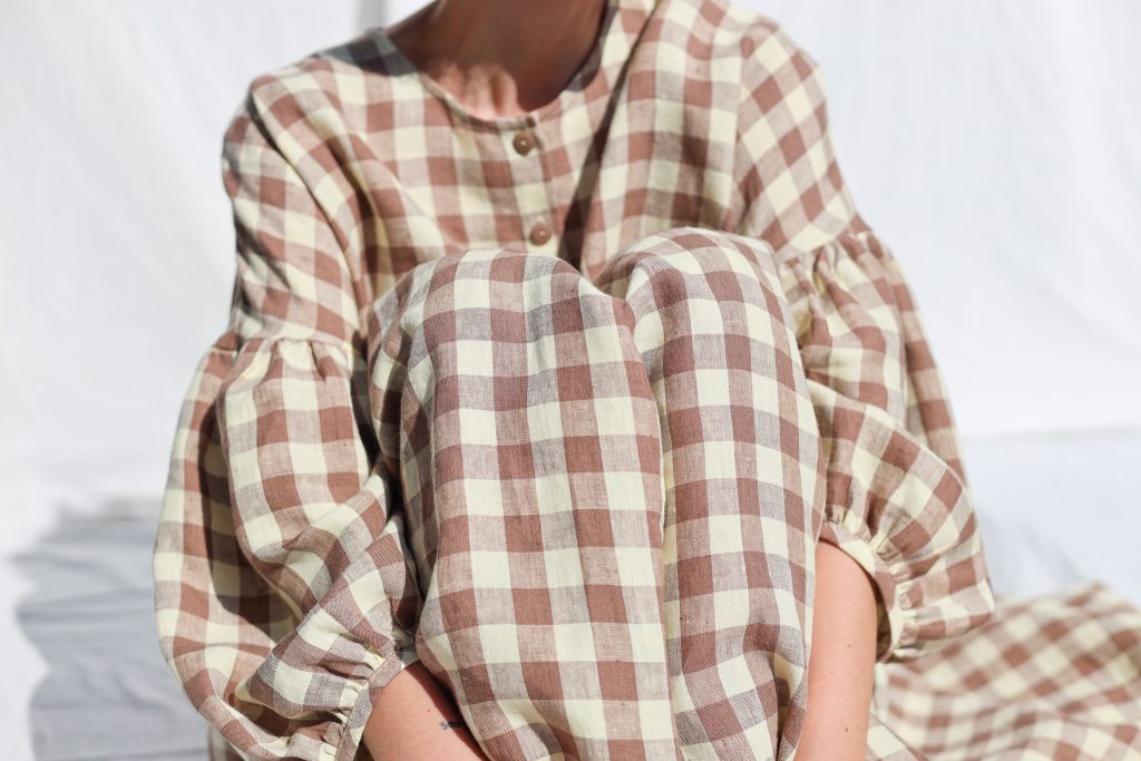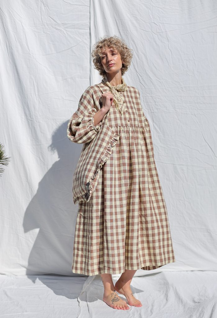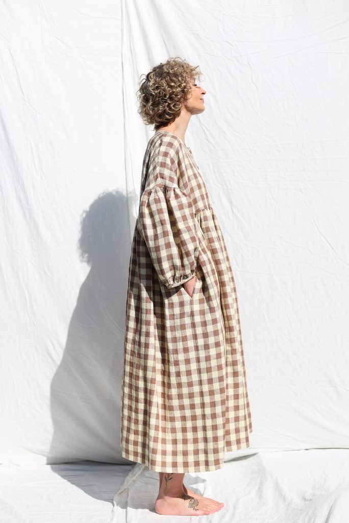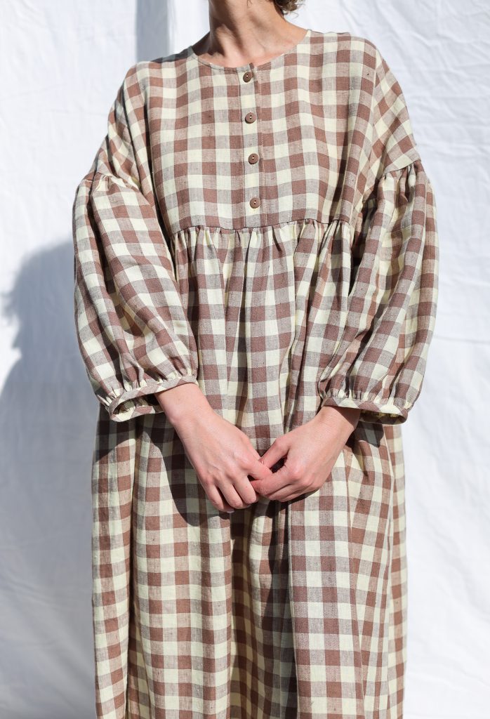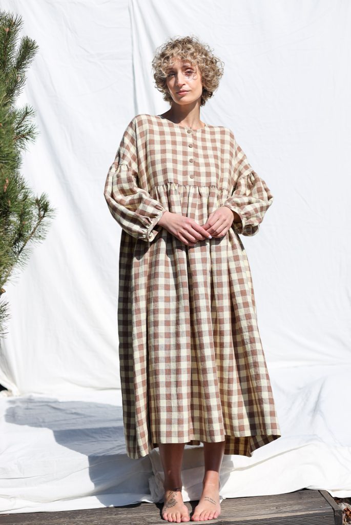 Midi-length oversized dress made in mid-weight pre-washed and exclusively woven Hazel & Butter Yellow Checks color linen. Easy to wear, elegant, and feminine look. Perfect dress for a special occasion or to wear every day. Layer alone with your favorite sandals, later – with our needlecord or denim jacket and favorite sneakers.