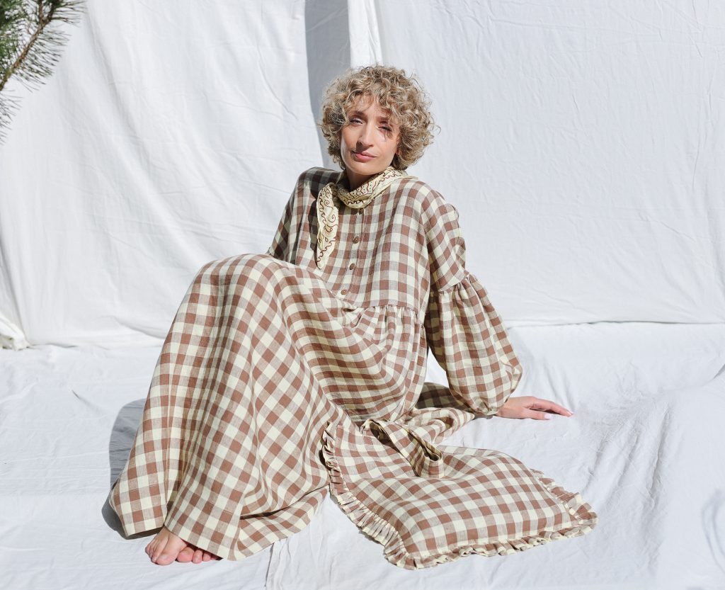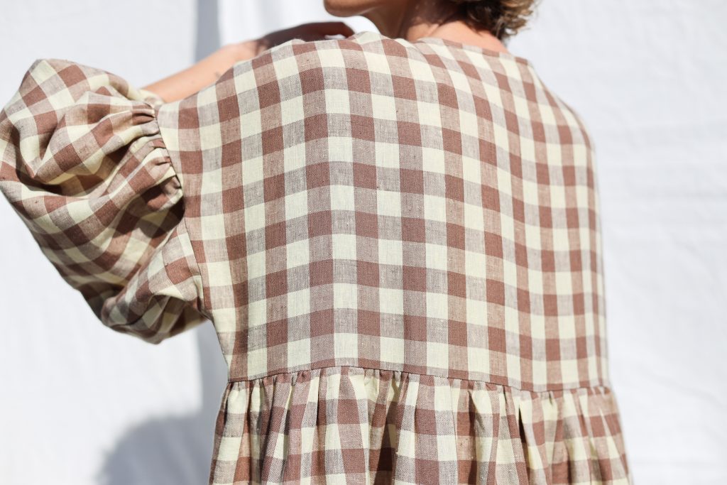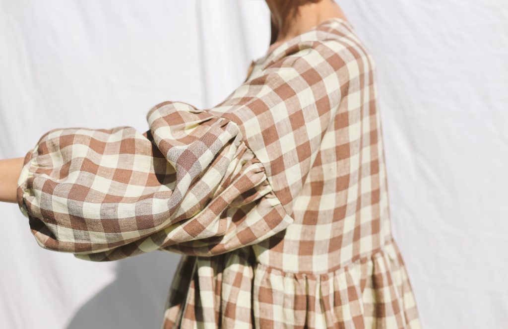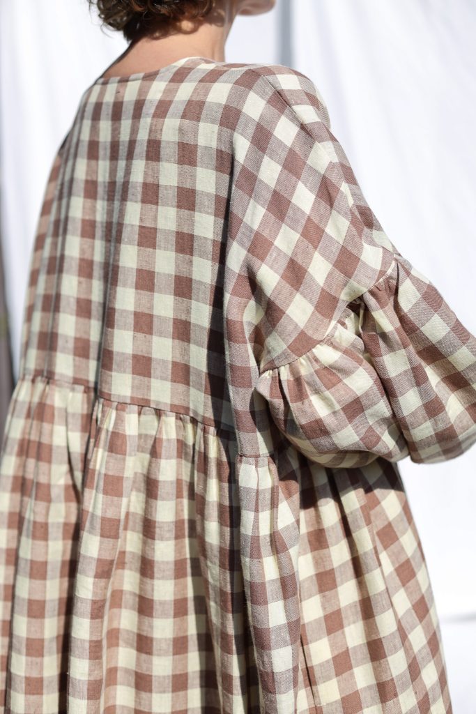 Midi-length oversized dress made in mid-weight pre-washed and exclusively woven Hazel & Butter Yellow Checks color linen. Easy to wear, elegant, and feminine look. Perfect dress for a special occasion or to wear every day. Layer alone with your favorite sandals, later – with our needlecord or denim jacket and favorite sneakers.
