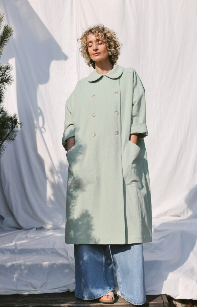 A beautifully crafted long coat made from textured highest quality linen fabric, featuring a soft rounded collar, double‑breasted button closure and an effortlessly oversized silhouette. Its relaxed drape, wide sleeves and large front pockets create a timeless, artisanal look—perfect for layering and everyday comfort.