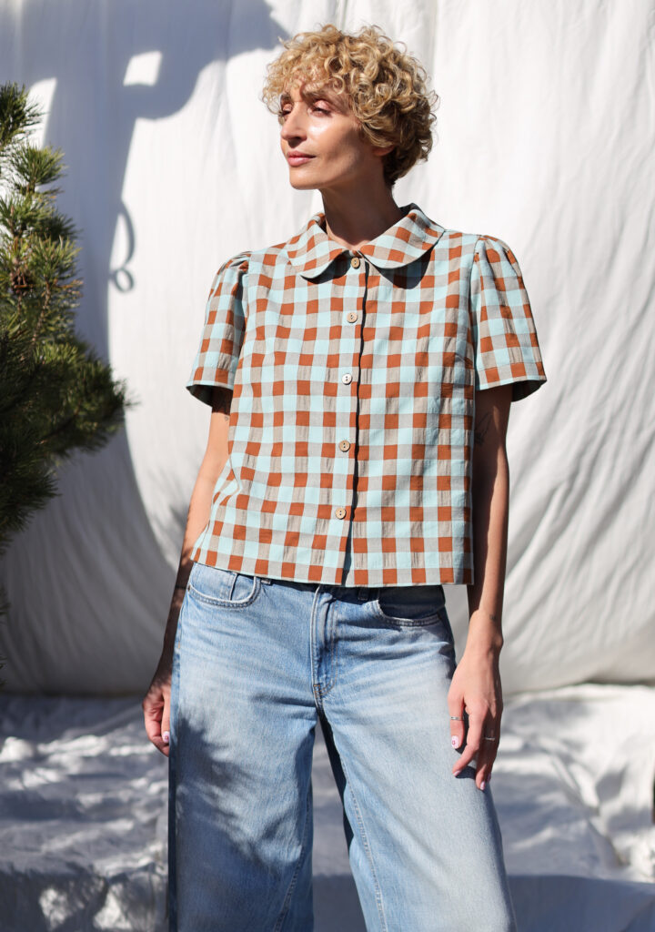 Simona is wearing blouse in a size S and is 172 cm/5’8″ tall.