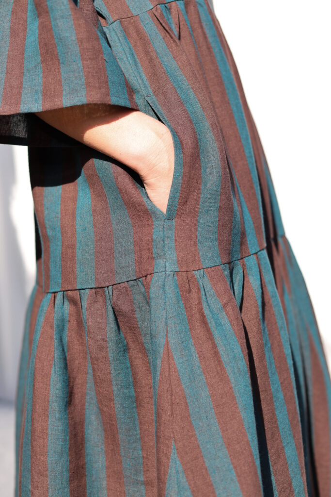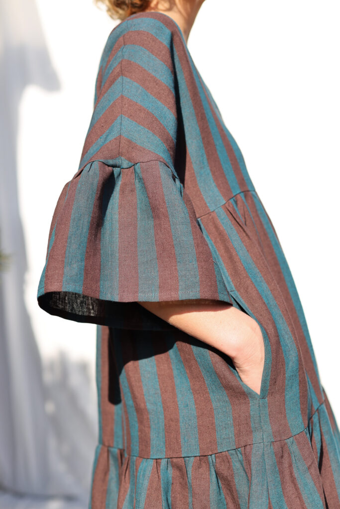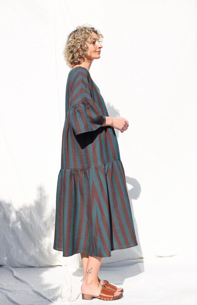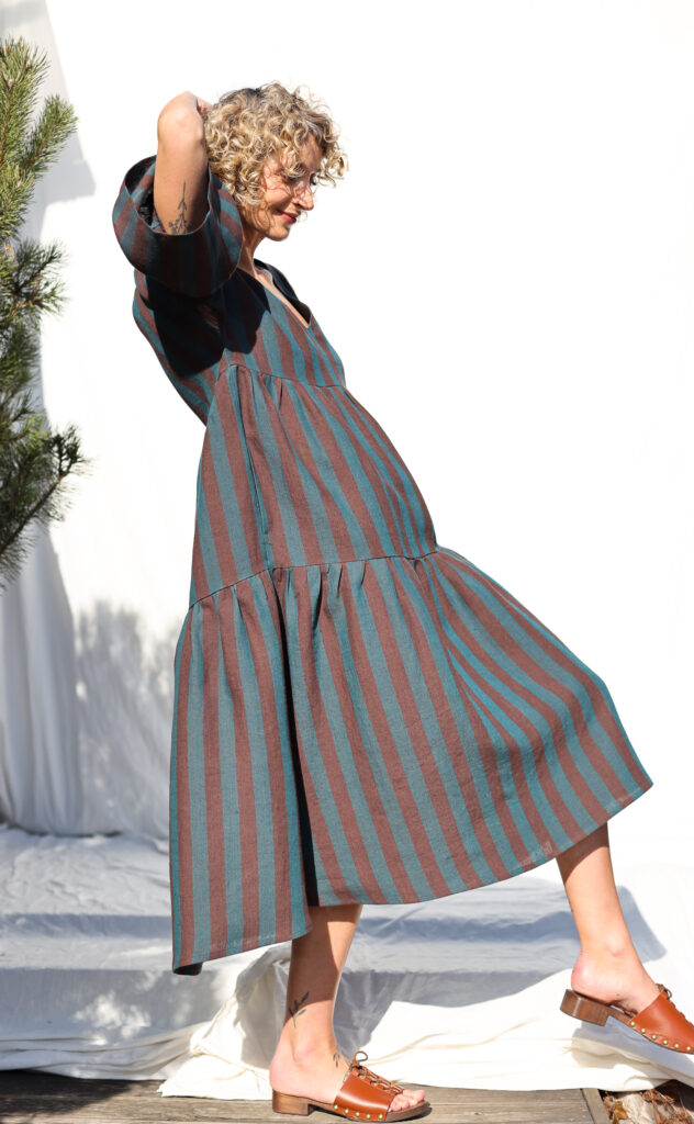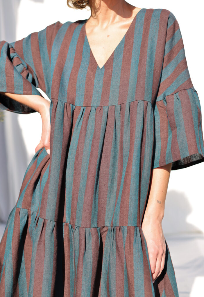 Linen-tiered dress made in exclusively woven Brown and Dark Turquoise Stripes color linen. Easy and relaxed cut, comfortable fit, elegant and feminine look for everyday wear or special occasion.