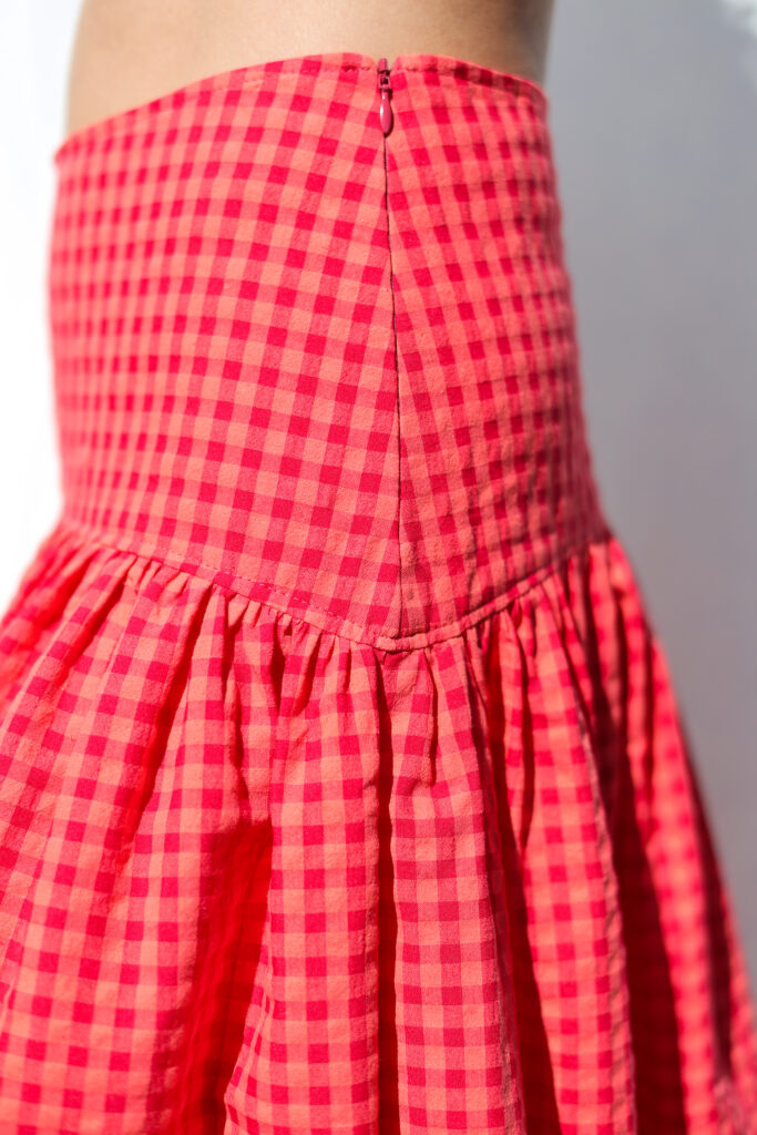 Simona is wearing the skirt in a size S and is 172 cm/5’8″ tall.